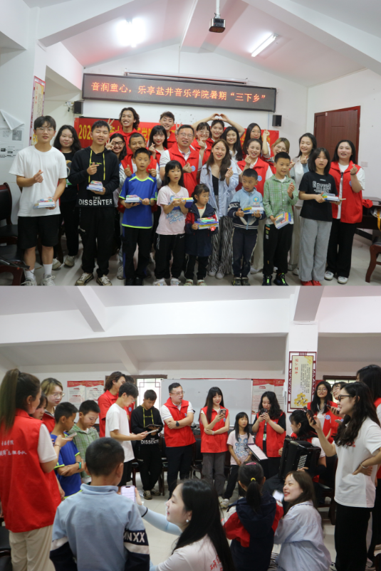 4日,实践队前往中益乡盐井村践行美育乡村,用音乐关爱留守儿童,暖心田、润童心,开展温暖有爱的音乐课。由于隔代养育、长期与父母分别等现实情况,留守儿童存在着隐性或者显性的情感缺失,大多表现得内敛、敏感、偏激。实践队队员们带领小朋友们认识、鉴赏手风琴、巴松、古琴等乐器,引导小朋友们通过音乐去记录记忆,表达情感,使得心灵得到疗愈,最后教唱了一曲合唱《送别》,给小朋友们埋下了深深的音乐情感寄托。课堂结束后,实践队为留守儿童们送上文具和读物,希望通过这样一次行动为留守儿童们点亮一盏灯。