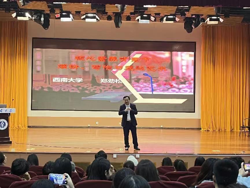 在谈到演讲与写作技巧时,他为同学们现场展示了自己独有的“郑氏”演讲法,包括主题、材料、结构、语言等四要素齐全,同时点、线、面、体都要具备才能稳操胜券,达到理想的演讲效果。在讲座中,郑老师虽不是音乐专业出身,但多次向同学们展示演唱了自己的原创作品,赢得在场同学们的阵阵掌声与欢呼声,这些不仅展示出郑老师深厚的艺术修养,更为同学们提供了鲜活的学习范例。